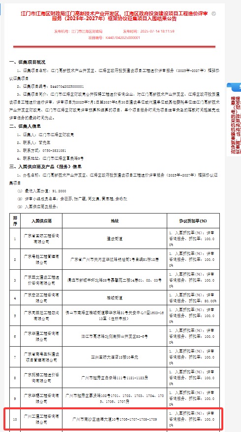 公司近期中标江門市江海區财政局江門高新技術産業開發區、江海區政府投資建設項目工程造價評審服務(2025年-2027年)框架協議征集項目
