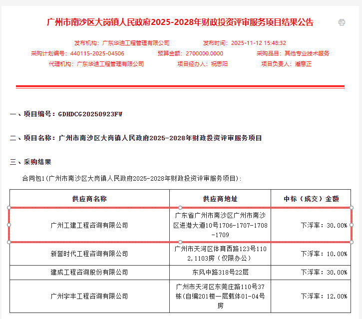 公司近期中标廣州市南沙區大崗鎮人民政府2025-2028年财政投資評審服務項目