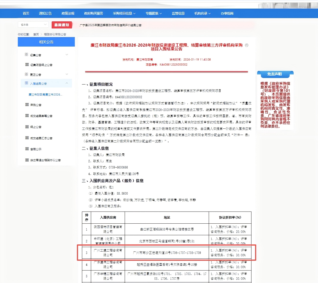 公司近期中标廉江市财政局廉江市2026-2028年财政投資建設工程預、結算審核第三方評審機構採購項目