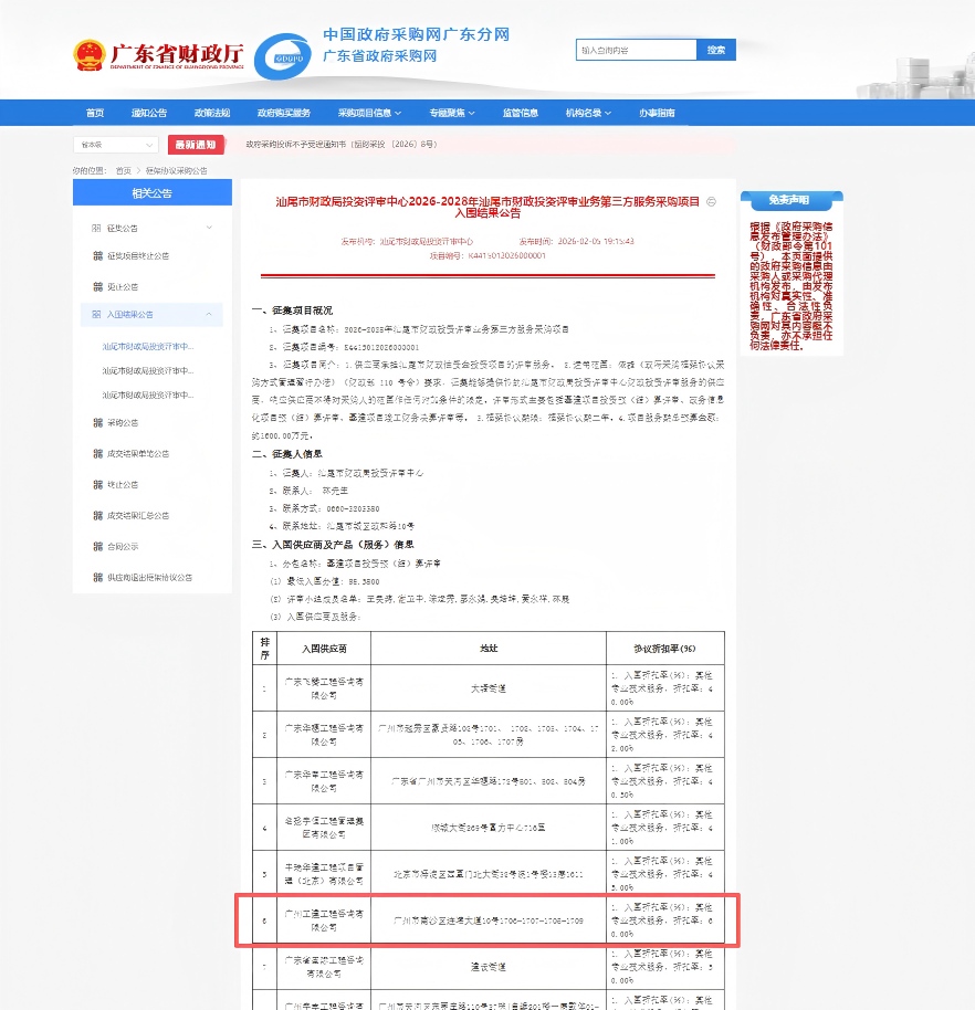 公司近期中标廣東省省級财政評審第三方機構輔助服務(第七輪)
