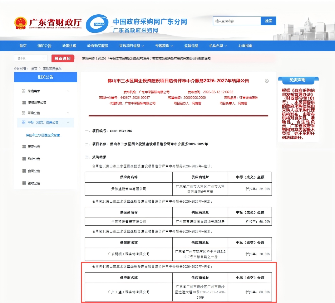 公司近期中标佛山市三水區國企投資建設項目造價評審中介服務2026-2027年